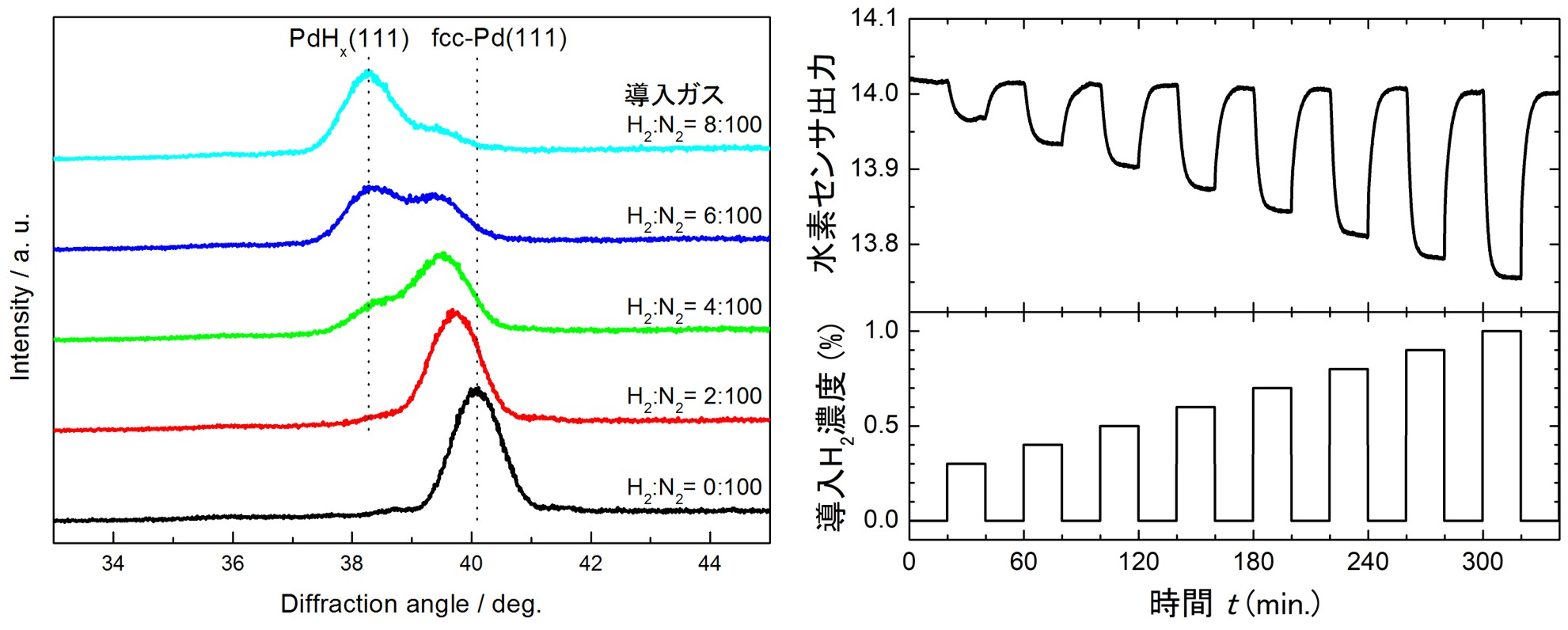 図3.X線回折によるPd薄膜の水素化in-situ観察 図4.本研究室で開発された水素センサの水素検出特性